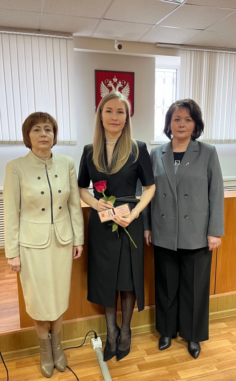 3 апреля 2026 г. заместитель Председателя Верховного Суда Республики Мордовия Г.Ф. Смелкова в торжественной обстановке вручила служебное удостоверение федеральному судье Тулаевой О.М., подтверждающее её полномочия и статус в судебной системе страны.