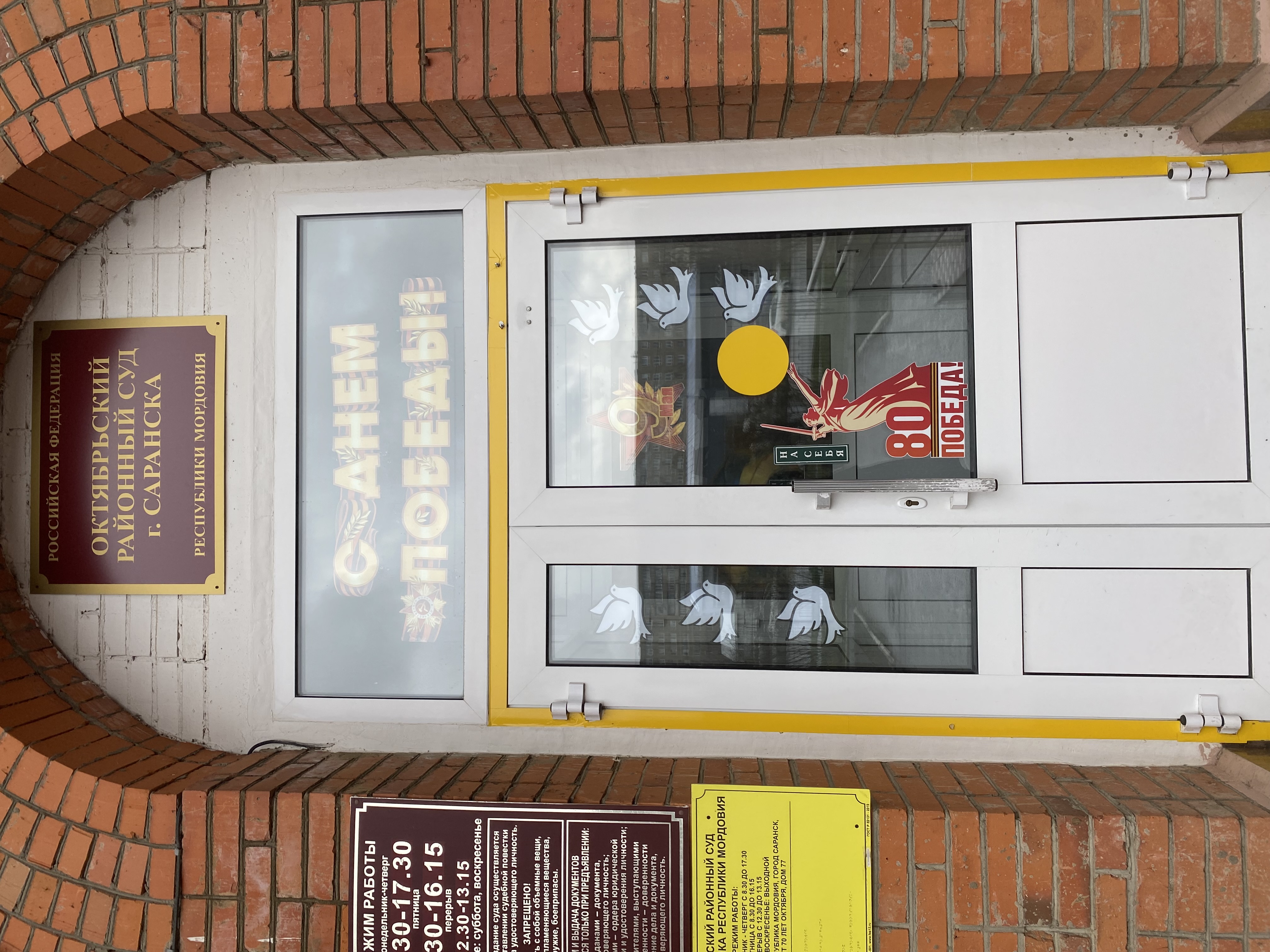 Всероссийская акция «Окна Победы» – одна из главных памятных акций в честь Праздника Великой Победы. По всей стране люди украшают окна к 9 мая, чтобы почтить память Героев Отечества и одновременно создать особую атмосферу как дома, так и на родных улицах. Сегодня к этой акции присоединился и Октябрьский районный суд г.Саранска, включая постоянное судебное присутствие в с. Кочкурово, украсив входные группы и окна символами предстоящего праздника. Акция ″Окна Победы″ позволяет выразить свою глубокую благодарность и уважение к героическому прошлому страны. Отдавая должное подвигам предков в Великой Отечественной войне, мы сохраняем наше великое наследие и передаем его будущим поколениям.