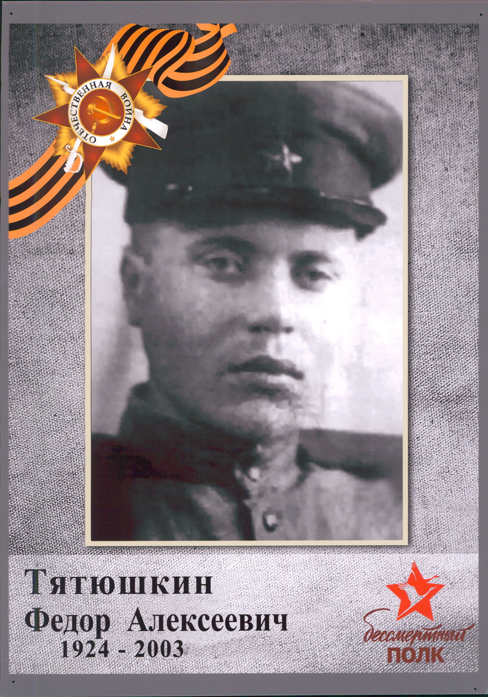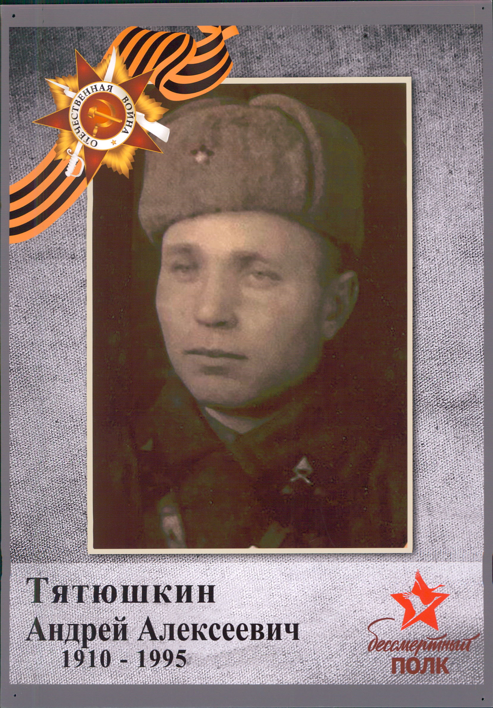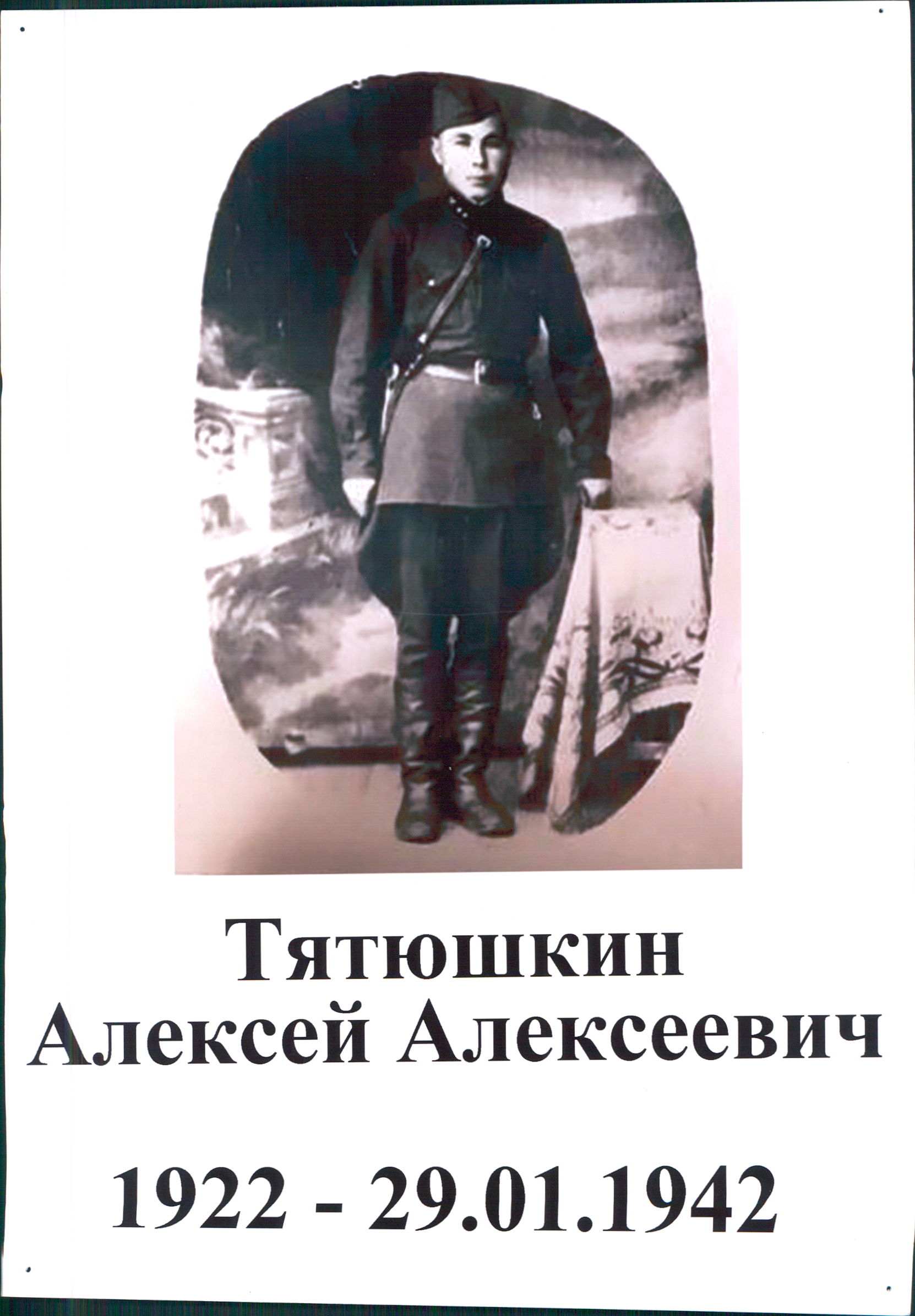 Тятюшкин Андрей Алексеевич родился в 1910 году в с.Семилей Кочкуровского района Мордовской АССР. В июне 1941 года призван Кочкуровским РВК на защиту Родины. В суровые годы войны Тятюшкин А.А. честно выполнял свой патриотический долг, достойно нес службу в войсках Первого Украинского фронта. За отличную службу командующим войсками Маршалом Советского Союза Коневым И.С. ему вручена Благодарственная грамота. Из наградного листа от 16 мая 1945 года усматривается, что старший телефонист взвода связи гвардии старший сержант Тятюшкин А.А. во время боев действовал смело, умело и мужественно. При прорыве вражеской обороны на Нейсе, при форсировании Шпрее, в боях на подступах к Берлину и в самом городе с 16 апреля по 3 мая Тятюшкин А.А. своей отважной работой обеспечил связь, чем во многом способствовал хорошей боевой деятельности дивизиона. За проявленные мужество и героизм Тятюшкин А.А. удостоен правительственной награды - Ордена Красной звезды. Кроме того, Тятюшкин А.А. награжден медалями «За Победу над Германией в Великой Отечественной войне 1941-1945»; «За боевые заслуги»; «За взятие Берлина»; «За освобождение Праги»; «За оборону Москвы» и Орденом Отечественной войны 1 степени. По окончанию Великой Отечественной войны Тятюшкин А.А. вернулся в родное село, где занимался восстановлением народного хозяйства. Всю последующую мирную жизнь работал в колхозе имени Н.К. Крупской, где занимал руководящие должности. Тятюшкин А.А. прожил яркую, насыщенную событиями жизнь, умер в 1995 году в возрасте 85 лет. Тятюшкин Федор Алексеевич, 1924 года рождения, воевал в составе 103 стрелкового полка, участвовал в боях с немецкими захватчиками в районе города Пушкина, неоднократно выступал в качестве разведчика. При выполнении задания доставил контрольного пленного, во время пути около траншеи противника был ранен в левый глаз. Награжден медалью «За отвагу». Вернувшись с войны, Тятюшкин Ф.А. всю последующую жизнь работал в родном селе Семилей Кочкуровского района Мордовской АССР. Умер в 2003 году, в возрасте 79 лет. Тятюшкин Алексей Алексеевич, 1922 года рождения, в 1940 году призван в ряды Красной Армии. В декабре 1941 года в составе мастерской боепитания 1096-го полка направлен на фронт. С войны Тятюшкин А.А. не вернулся, его родителям пришло письмо с сообщением о гибели их сына 29 января 1942 года около д.Щербино Мосальского района Калужской области. Похоронен Тятюшкин А.А. в д.Сычево.